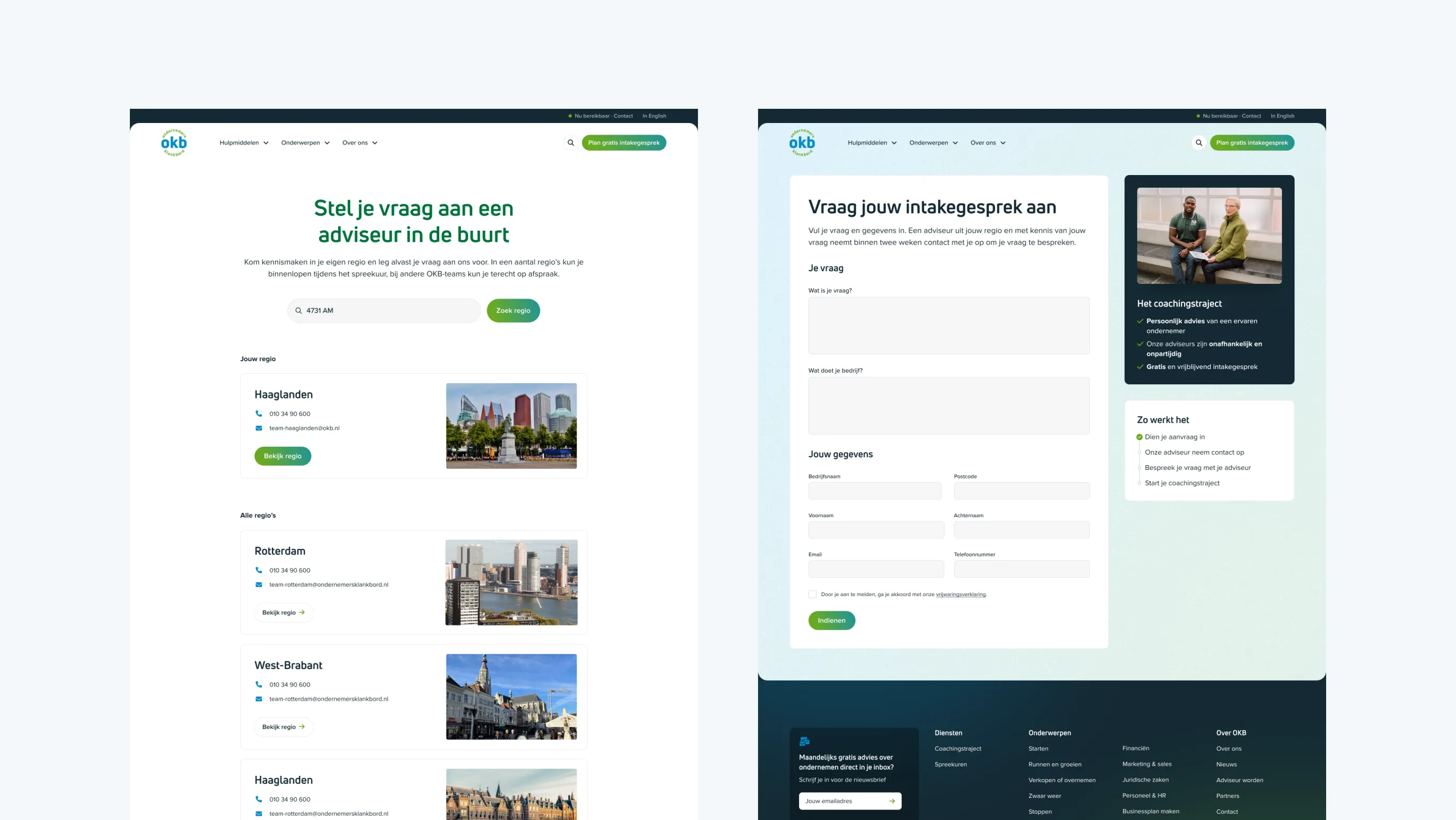 De nieuwe website is ingericht om ondernemers direct verder te helpen. We hebben de aanmeldflow strategisch herzien, met als doel meer duidelijkheid en transparantie te bieden voor de ondernemer en daarmee tegelijk de conversie te verhogen. Door de bestaande content beter vindbaar te maken, biedt de website ook op een laagdrempelige manier hulp. Sterke visuals, video’s en ervaringen laten zien wat OKB doet en maken de stap om hulp in te schakelen kleiner.